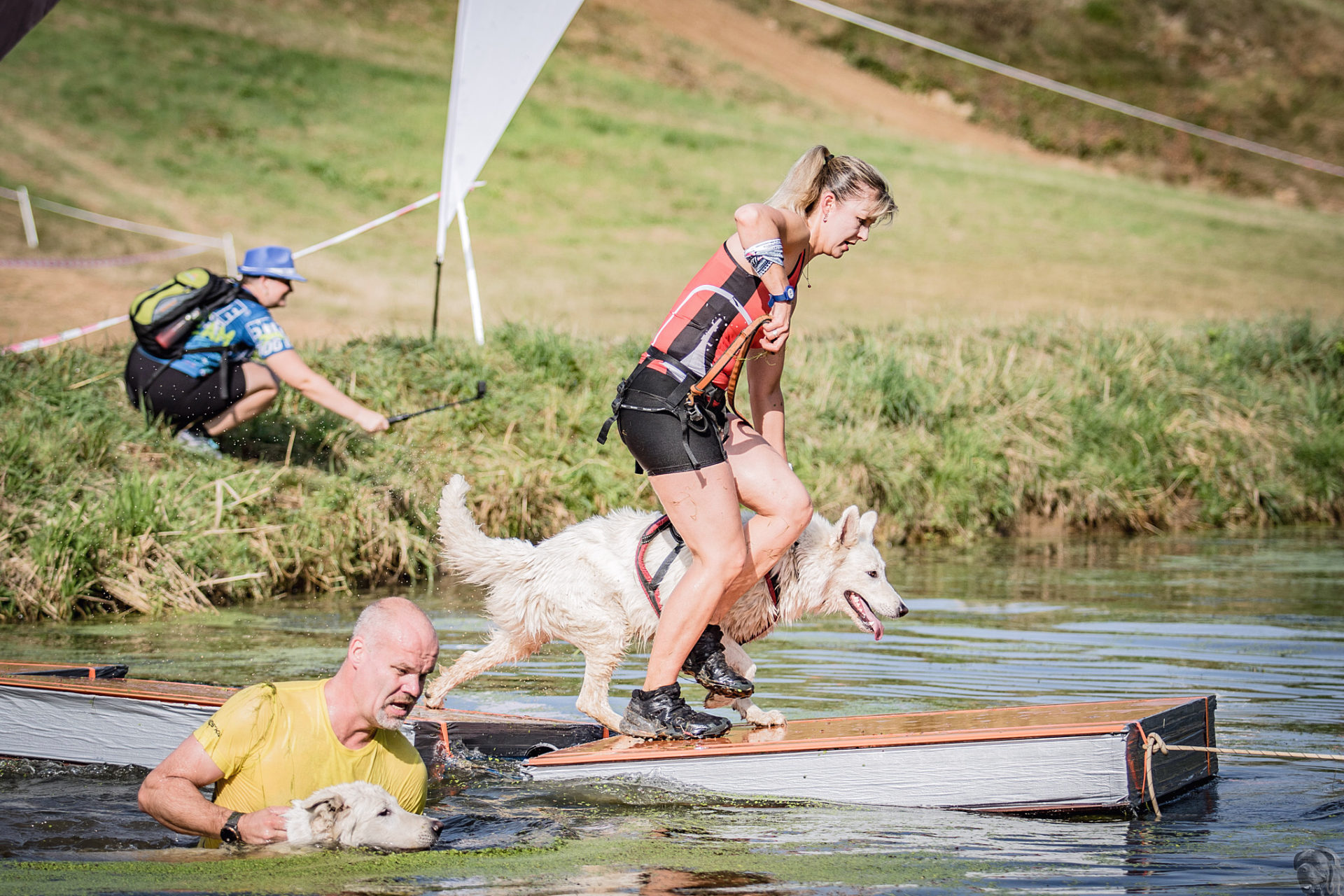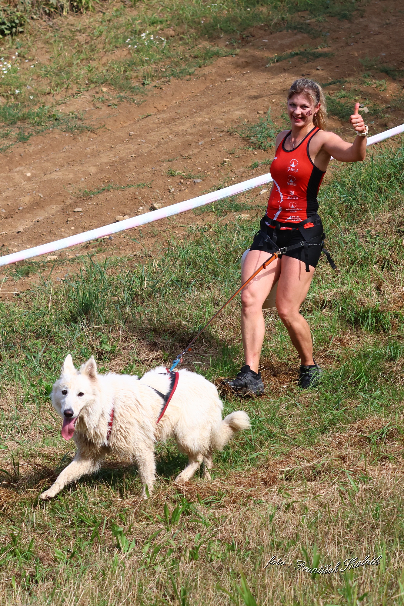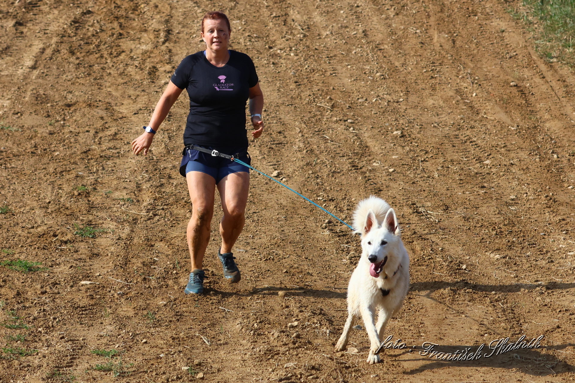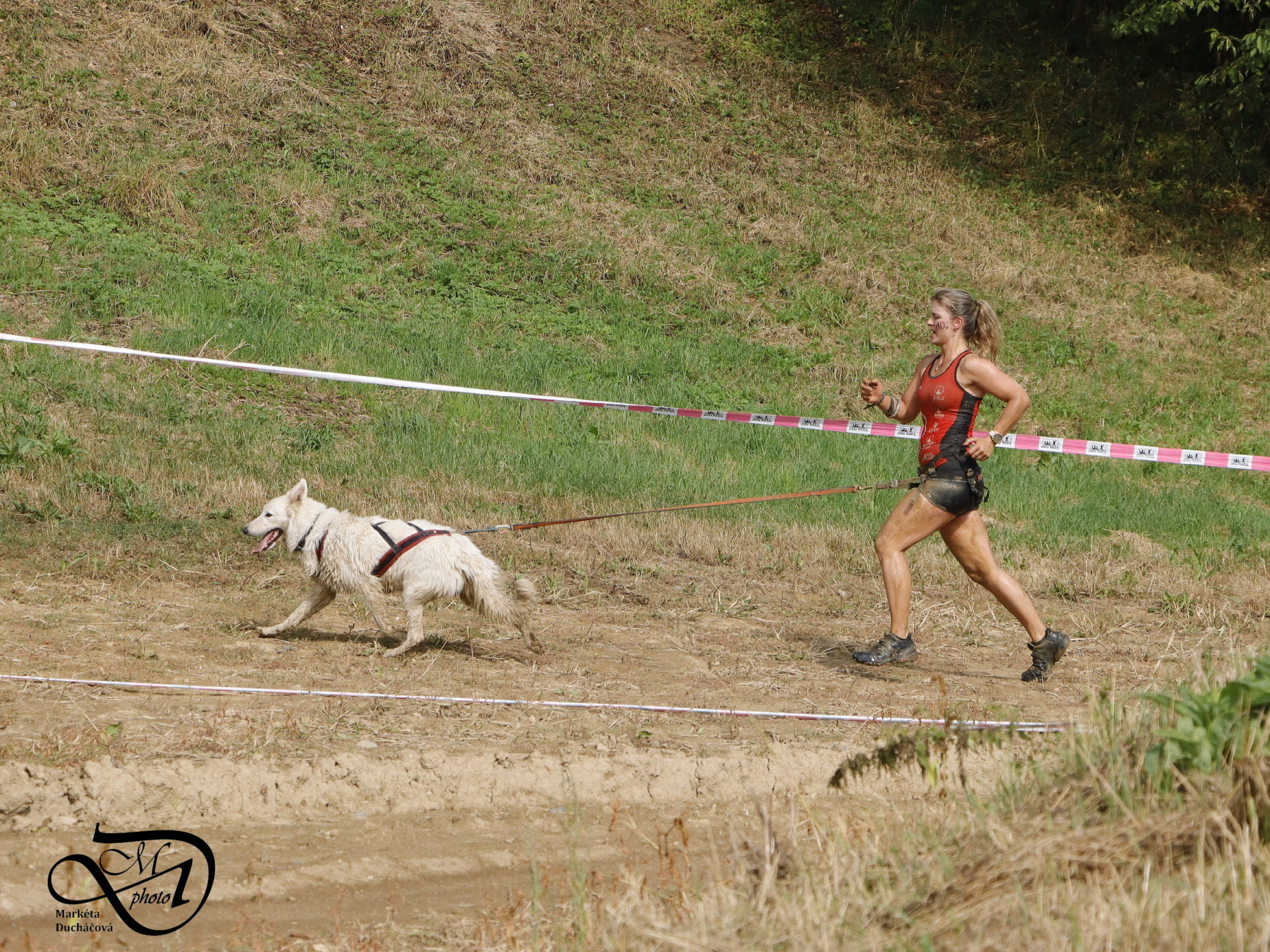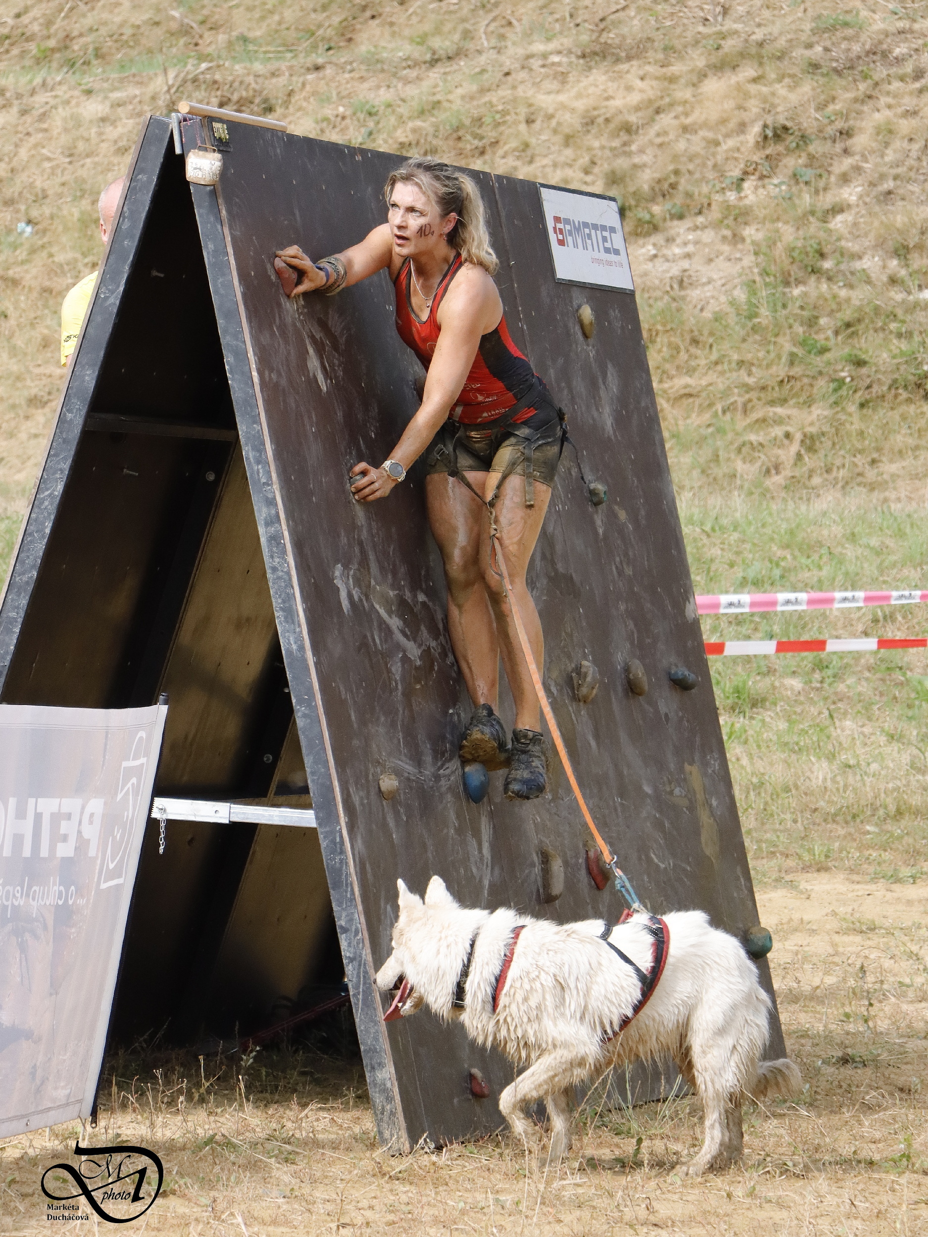 Startovali jsme hned po 9. hod, tak holt musíme běžet s větrem o závod, abychom se cestou stíhali ochlazovat a než sluníčko vyšplhá vysoko nad obzor, abychom byli zpátky. Cestou byla spousta vody (a chaluh a bahna a kopců), tak se člověk (i pes) naštěstí každou chvíli v něčem zchladil. Krosili jsme to po motokrosové trati levá, pravá, nahoru a hned zase dolů. Z pohledu diváka určitě zajímavá podívaná. Naprosto škodolibě se nám smáli, jak my na trati potíme krev. Já běžela s Amigou, Erik se poprvé na start postavil s Frozen. Frozen totiž dřív vždycky raději běhala s něžným pohlavím, s chlapama jí to nebavilo. Ale konečně pochopila, že i chlapy jsou co k čemu a vzala je na milost. I přes všechna úskalí jsme si závod užívali. Až do chvíle, než jsem doběhla k hodu oštěpem a měla se trefit na cíl. Házení není má silná stránka. Klasika, oštěp byl lehčí než jsem předpokládala, tak s sebou plácnul daleko před označeným prostorem. Pak se tam sice doklouzal, ale to prý „sorry jako“ – handicap „vězeň“. Svázali mi ruce stahovací páskou a prý další pomocník, kterého potkám, mě osvobodí… 100 m, 200 m, půl kiláku… začala jsem mít strach jestli si pomocník nepotřeboval zrovna odskočit. Ne, fakt byli tak zákeřní a nechali nás svázané běžet asi kilometr. Kdo tohle vymyslel, ten by fakt zasloužil,… ale ne metál, ale přes …. Asi se radši na stará kolena naučím házet. Běžím tedy dál, konečně mám obě ruce volné, tak se těším, že to půjde líp. Pěkný kulový. Další kilometr hnusný táhlý kopec, takže zase nic moc běhatelného. Uff, konečně nahoře. Vítaný odpočinek na pár překážkách, přešoupám slackline, odtáhnu pneumatiku, proplazím bazének a příjemně osvěžená valím dál. Erika jsem někde setřásla, asi kilometr za mnou nikde nikdo. Ale jen na chvíli, to nejtěžší teprve mělo přijít. Bylo jasné, že mi za chvíli bude zase dýchat na paty. Následoval krásný rychlý úsek mezi kukuřičnými poli, mírný seběh, travnatá cesta, běželo se mi kupodivu krásně a lehce, Amiga letěla přede mnou. Prostě paráda. Za kilometr odbočka do pole. To jako fakt? Jo, fakt. Další úsek přímo kukuřicí, chvíli po kraji, chvíli mezi rigoly, vzrostlými klasy a balvany z pole. To už taková parádička nebyla. Šlahouny mě šlehaly do obličeje, na cestu jsem místy přes hustý porost sotva viděla, volala jsem na Amigu „levá“, aby vyběhla aspoň na kraj pole, ale kukuřice byla jako neprostupná hradba. Konečně světlo na konci tunelu a ven z toho. Protože jsme si teď vlastně tak trochu odpočinuli, tak si pro nás připravili, už zase zpátky na motokrosové trati, pár silových záludností. Seběh a výběh s 5 kg barelem s vodou a hned o kousek dál 2x nahoru a dolů v drsném převýšení. Ani nevím, co bylo horší. Z kopce se bojím a do kopce docházely síly. V těchto pasážích má Erik nade mnou jasně navrch, tak celý můj náskok rychle dohnal a poslední dvě překážky už jsme překonávali společně a pak i společně proběhli cílem. Jako třešnička na dortu byla, že jsme se oba ve svých kategoriích umístili na druhém místě. V cíli už Erik zase šířil optimismem a prvotní rozladění bylo to tam. (Naštěstí!).