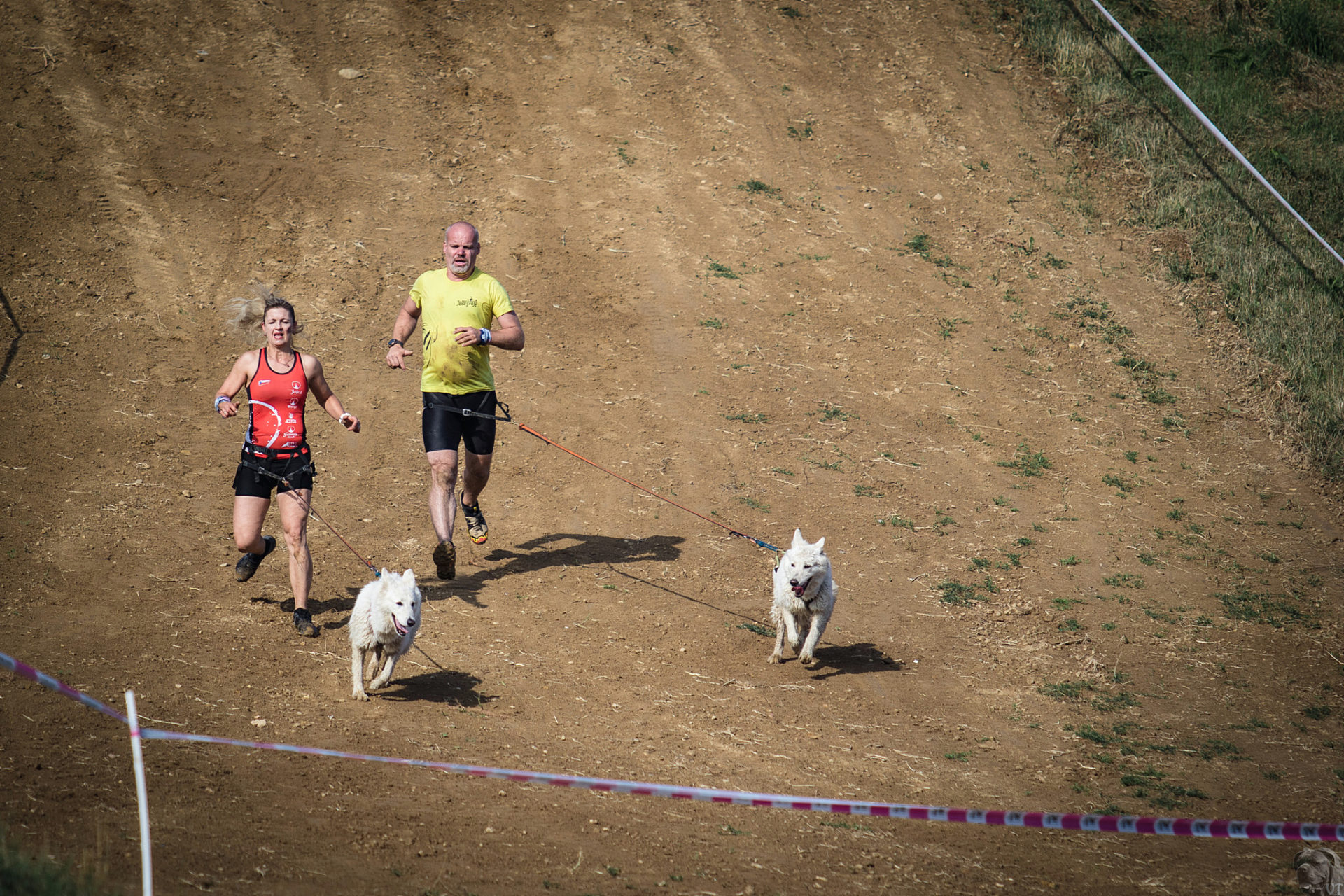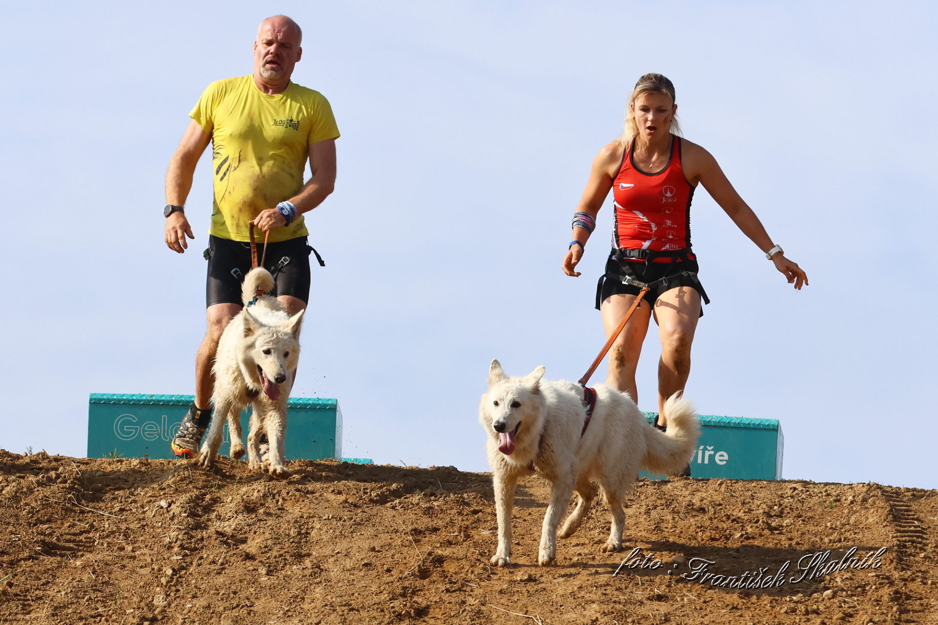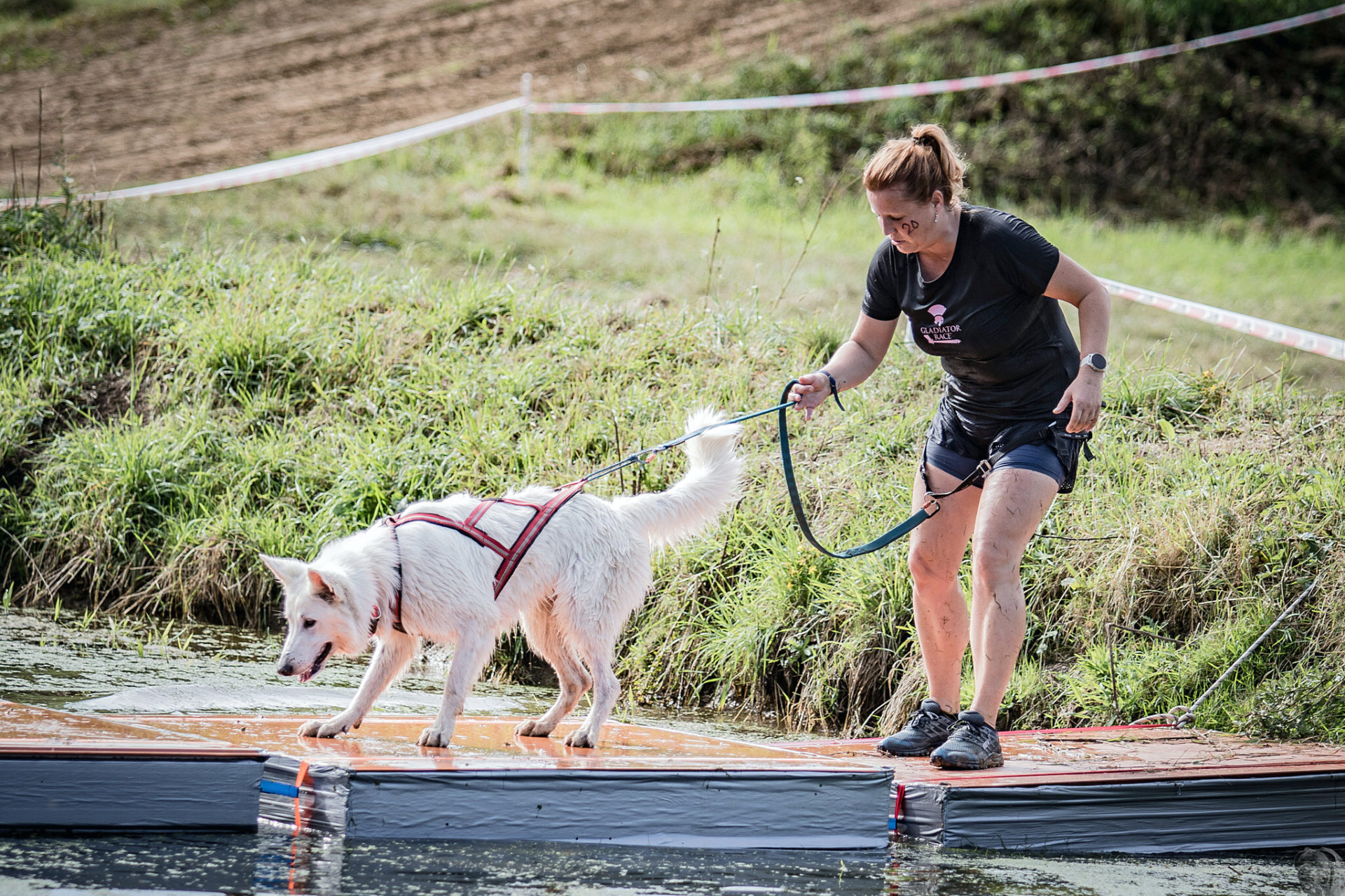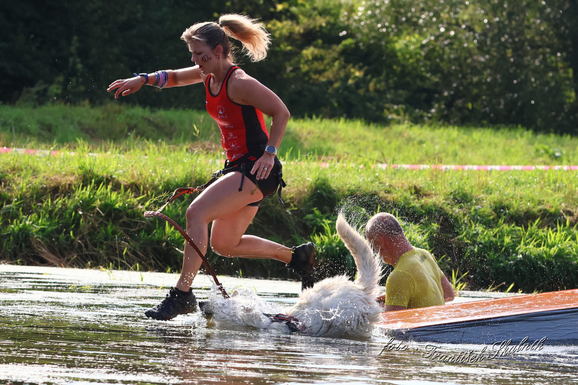 Startovali jsme hned po 9. hod, tak holt musíme běžet s větrem o závod, abychom se cestou stíhali ochlazovat a než sluníčko vyšplhá vysoko nad obzor, abychom byli zpátky. Cestou byla spousta vody (a chaluh a bahna a kopců), tak se člověk (i pes) naštěstí každou chvíli v něčem zchladil. Krosili jsme to po motokrosové trati levá, pravá, nahoru a hned zase dolů. Z pohledu diváka určitě zajímavá podívaná. Naprosto škodolibě se nám smáli, jak my na trati potíme krev. Já běžela s Amigou, Erik se poprvé na start postavil s Frozen. Frozen totiž dřív vždycky raději běhala s něžným pohlavím, s chlapama jí to nebavilo. Ale konečně pochopila, že i chlapy jsou co k čemu a vzala je na milost. I přes všechna úskalí jsme si závod užívali. Až do chvíle, než jsem doběhla k hodu oštěpem a měla se trefit na cíl. Házení není má silná stránka. Klasika, oštěp byl lehčí než jsem předpokládala, tak s sebou plácnul daleko před označeným prostorem. Pak se tam sice doklouzal, ale to prý „sorry jako“ – handicap „vězeň“. Svázali mi ruce stahovací páskou a prý další pomocník, kterého potkám, mě osvobodí… 100 m, 200 m, půl kiláku… začala jsem mít strach jestli si pomocník nepotřeboval zrovna odskočit. Ne, fakt byli tak zákeřní a nechali nás svázané běžet asi kilometr. Kdo tohle vymyslel, ten by fakt zasloužil,… ale ne metál, ale přes …. Asi se radši na stará kolena naučím házet. Běžím tedy dál, konečně mám obě ruce volné, tak se těším, že to půjde líp. Pěkný kulový. Další kilometr hnusný táhlý kopec, takže zase nic moc běhatelného. Uff, konečně nahoře. Vítaný odpočinek na pár překážkách, přešoupám slackline, odtáhnu pneumatiku, proplazím bazének a příjemně osvěžená valím dál. Erika jsem někde setřásla, asi kilometr za mnou nikde nikdo. Ale jen na chvíli, to nejtěžší teprve mělo přijít. Bylo jasné, že mi za chvíli bude zase dýchat na paty. Následoval krásný rychlý úsek mezi kukuřičnými poli, mírný seběh, travnatá cesta, běželo se mi kupodivu krásně a lehce, Amiga letěla přede mnou. Prostě paráda. Za kilometr odbočka do pole. To jako fakt? Jo, fakt. Další úsek přímo kukuřicí, chvíli po kraji, chvíli mezi rigoly, vzrostlými klasy a balvany z pole. To už taková parádička nebyla. Šlahouny mě šlehaly do obličeje, na cestu jsem místy přes hustý porost sotva viděla, volala jsem na Amigu „levá“, aby vyběhla aspoň na kraj pole, ale kukuřice byla jako neprostupná hradba. Konečně světlo na konci tunelu a ven z toho. Protože jsme si teď vlastně tak trochu odpočinuli, tak si pro nás připravili, už zase zpátky na motokrosové trati, pár silových záludností. Seběh a výběh s 5 kg barelem s vodou a hned o kousek dál 2x nahoru a dolů v drsném převýšení. Ani nevím, co bylo horší. Z kopce se bojím a do kopce docházely síly. V těchto pasážích má Erik nade mnou jasně navrch, tak celý můj náskok rychle dohnal a poslední dvě překážky už jsme překonávali společně a pak i společně proběhli cílem. Jako třešnička na dortu byla, že jsme se oba ve svých kategoriích umístili na druhém místě. V cíli už Erik zase šířil optimismem a prvotní rozladění bylo to tam. (Naštěstí!).