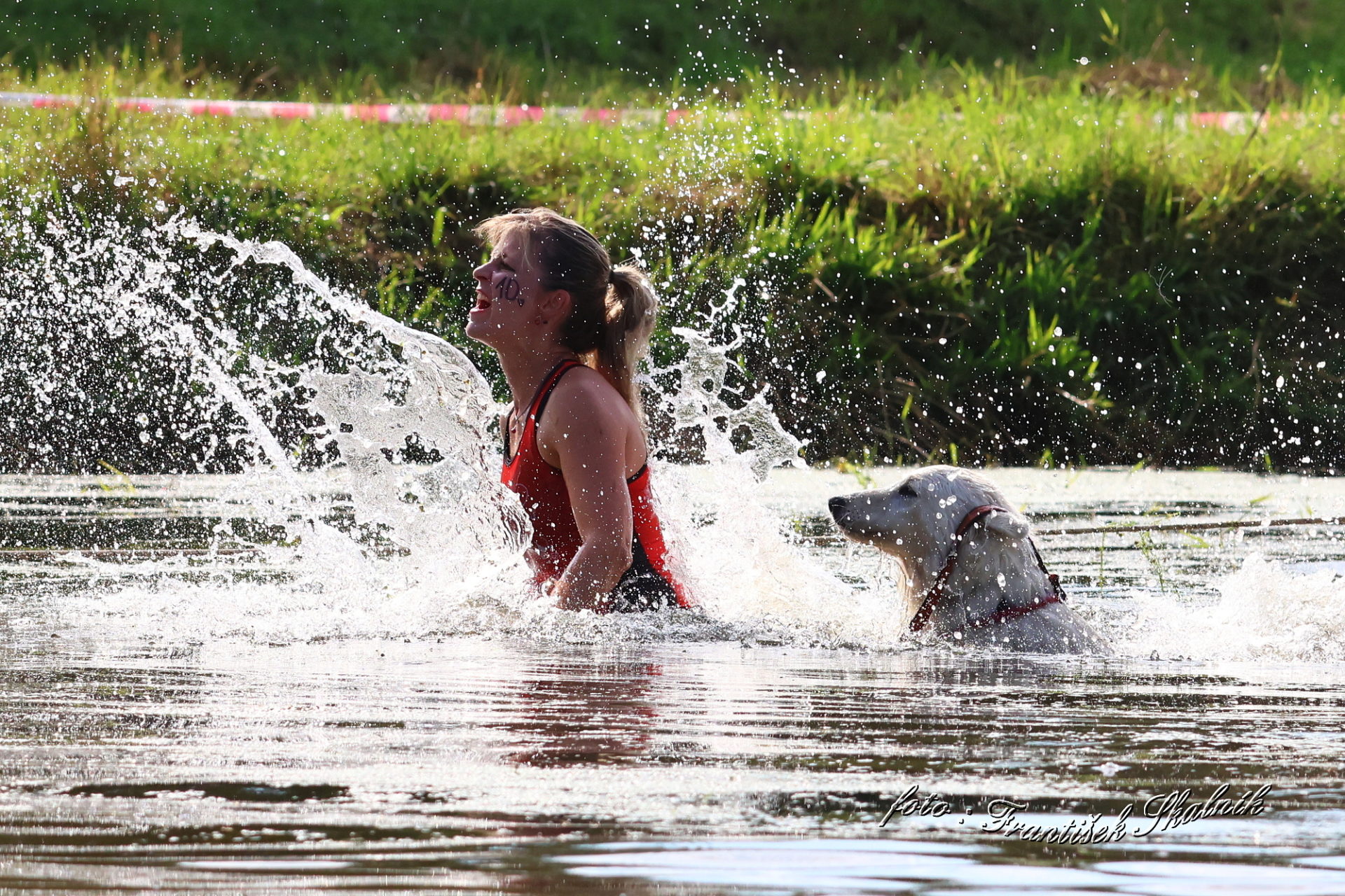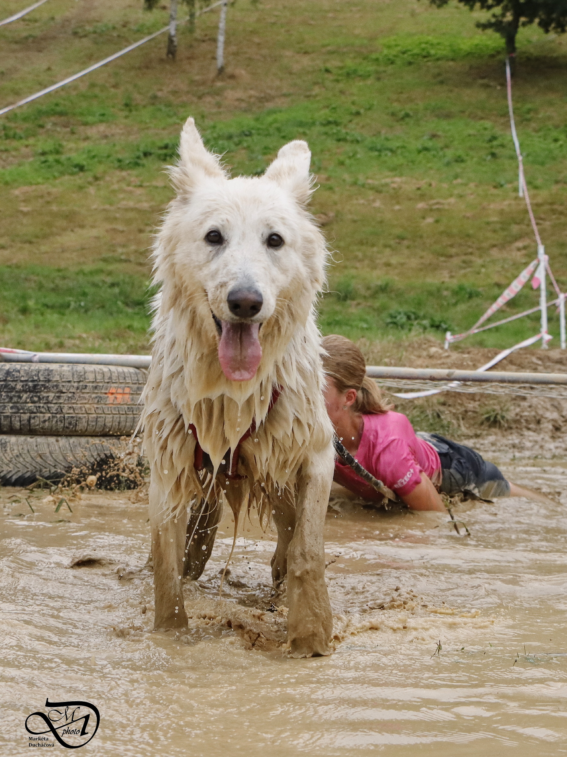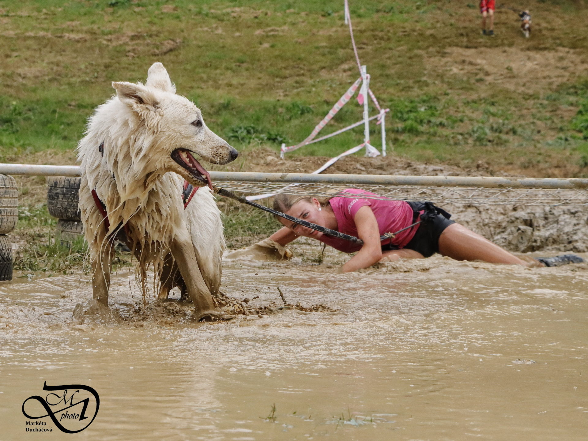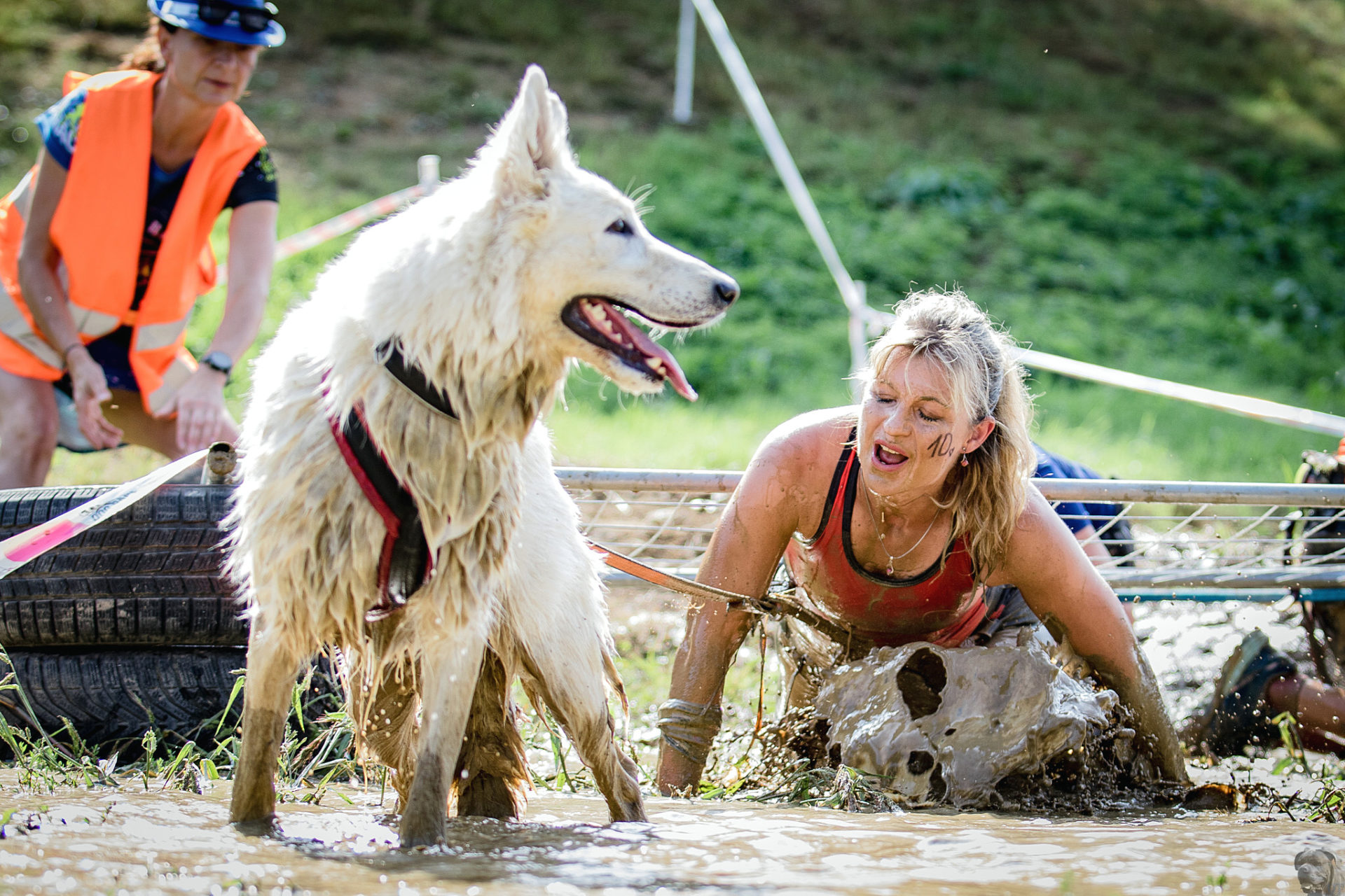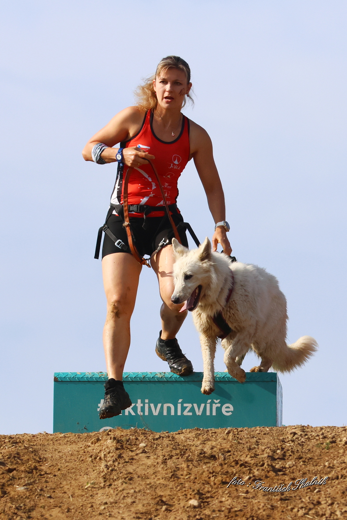 Startovali jsme hned po 9. hod, tak holt musíme běžet s větrem o závod, abychom se cestou stíhali ochlazovat a než sluníčko vyšplhá vysoko nad obzor, abychom byli zpátky. Cestou byla spousta vody (a chaluh a bahna a kopců), tak se člověk (i pes) naštěstí každou chvíli v něčem zchladil. Krosili jsme to po motokrosové trati levá, pravá, nahoru a hned zase dolů. Z pohledu diváka určitě zajímavá podívaná. Naprosto škodolibě se nám smáli, jak my na trati potíme krev. Já běžela s Amigou, Erik se poprvé na start postavil s Frozen. Frozen totiž dřív vždycky raději běhala s něžným pohlavím, s chlapama jí to nebavilo. Ale konečně pochopila, že i chlapy jsou co k čemu a vzala je na milost. I přes všechna úskalí jsme si závod užívali. Až do chvíle, než jsem doběhla k hodu oštěpem a měla se trefit na cíl. Házení není má silná stránka. Klasika, oštěp byl lehčí než jsem předpokládala, tak s sebou plácnul daleko před označeným prostorem. Pak se tam sice doklouzal, ale to prý „sorry jako“ – handicap „vězeň“. Svázali mi ruce stahovací páskou a prý další pomocník, kterého potkám, mě osvobodí… 100 m, 200 m, půl kiláku… začala jsem mít strach jestli si pomocník nepotřeboval zrovna odskočit. Ne, fakt byli tak zákeřní a nechali nás svázané běžet asi kilometr. Kdo tohle vymyslel, ten by fakt zasloužil,… ale ne metál, ale přes …. Asi se radši na stará kolena naučím házet. Běžím tedy dál, konečně mám obě ruce volné, tak se těším, že to půjde líp. Pěkný kulový. Další kilometr hnusný táhlý kopec, takže zase nic moc běhatelného. Uff, konečně nahoře. Vítaný odpočinek na pár překážkách, přešoupám slackline, odtáhnu pneumatiku, proplazím bazének a příjemně osvěžená valím dál. Erika jsem někde setřásla, asi kilometr za mnou nikde nikdo. Ale jen na chvíli, to nejtěžší teprve mělo přijít. Bylo jasné, že mi za chvíli bude zase dýchat na paty. Následoval krásný rychlý úsek mezi kukuřičnými poli, mírný seběh, travnatá cesta, běželo se mi kupodivu krásně a lehce, Amiga letěla přede mnou. Prostě paráda. Za kilometr odbočka do pole. To jako fakt? Jo, fakt. Další úsek přímo kukuřicí, chvíli po kraji, chvíli mezi rigoly, vzrostlými klasy a balvany z pole. To už taková parádička nebyla. Šlahouny mě šlehaly do obličeje, na cestu jsem místy přes hustý porost sotva viděla, volala jsem na Amigu „levá“, aby vyběhla aspoň na kraj pole, ale kukuřice byla jako neprostupná hradba. Konečně světlo na konci tunelu a ven z toho. Protože jsme si teď vlastně tak trochu odpočinuli, tak si pro nás připravili, už zase zpátky na motokrosové trati, pár silových záludností. Seběh a výběh s 5 kg barelem s vodou a hned o kousek dál 2x nahoru a dolů v drsném převýšení. Ani nevím, co bylo horší. Z kopce se bojím a do kopce docházely síly. V těchto pasážích má Erik nade mnou jasně navrch, tak celý můj náskok rychle dohnal a poslední dvě překážky už jsme překonávali společně a pak i společně proběhli cílem. Jako třešnička na dortu byla, že jsme se oba ve svých kategoriích umístili na druhém místě. V cíli už Erik zase šířil optimismem a prvotní rozladění bylo to tam. (Naštěstí!).