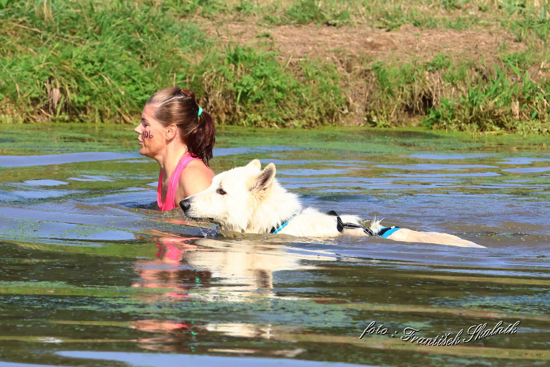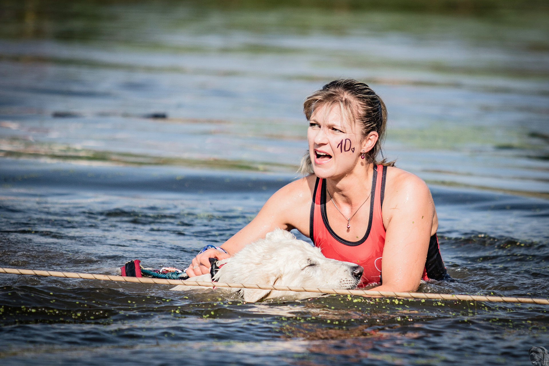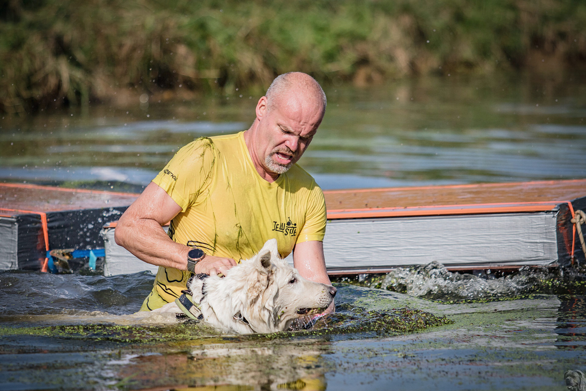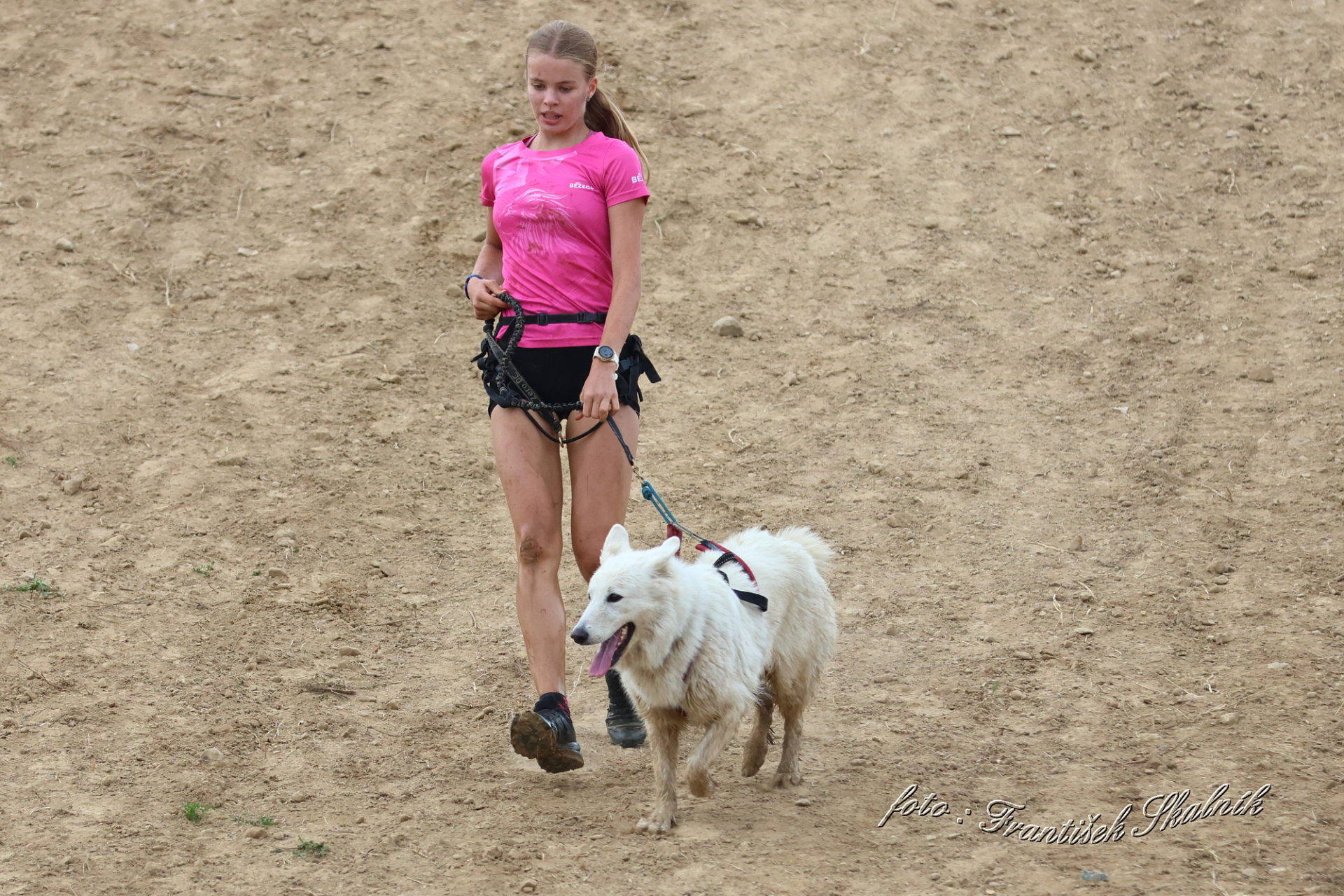 Startovali jsme hned po 9. hod, tak holt musíme běžet s větrem o závod, abychom se cestou stíhali ochlazovat a než sluníčko vyšplhá vysoko nad obzor, abychom byli zpátky. Cestou byla spousta vody (a chaluh a bahna a kopců), tak se člověk (i pes) naštěstí každou chvíli v něčem zchladil. Krosili jsme to po motokrosové trati levá, pravá, nahoru a hned zase dolů. Z pohledu diváka určitě zajímavá podívaná. Naprosto škodolibě se nám smáli, jak my na trati potíme krev. Já běžela s Amigou, Erik se poprvé na start postavil s Frozen. Frozen totiž dřív vždycky raději běhala s něžným pohlavím, s chlapama jí to nebavilo. Ale konečně pochopila, že i chlapy jsou co k čemu a vzala je na milost. I přes všechna úskalí jsme si závod užívali. Až do chvíle, než jsem doběhla k hodu oštěpem a měla se trefit na cíl. Házení není má silná stránka. Klasika, oštěp byl lehčí než jsem předpokládala, tak s sebou plácnul daleko před označeným prostorem. Pak se tam sice doklouzal, ale to prý „sorry jako“ – handicap „vězeň“. Svázali mi ruce stahovací páskou a prý další pomocník, kterého potkám, mě osvobodí… 100 m, 200 m, půl kiláku… začala jsem mít strach jestli si pomocník nepotřeboval zrovna odskočit. Ne, fakt byli tak zákeřní a nechali nás svázané běžet asi kilometr. Kdo tohle vymyslel, ten by fakt zasloužil,… ale ne metál, ale přes …. Asi se radši na stará kolena naučím házet. Běžím tedy dál, konečně mám obě ruce volné, tak se těším, že to půjde líp. Pěkný kulový. Další kilometr hnusný táhlý kopec, takže zase nic moc běhatelného. Uff, konečně nahoře. Vítaný odpočinek na pár překážkách, přešoupám slackline, odtáhnu pneumatiku, proplazím bazének a příjemně osvěžená valím dál. Erika jsem někde setřásla, asi kilometr za mnou nikde nikdo. Ale jen na chvíli, to nejtěžší teprve mělo přijít. Bylo jasné, že mi za chvíli bude zase dýchat na paty. Následoval krásný rychlý úsek mezi kukuřičnými poli, mírný seběh, travnatá cesta, běželo se mi kupodivu krásně a lehce, Amiga letěla přede mnou. Prostě paráda. Za kilometr odbočka do pole. To jako fakt? Jo, fakt. Další úsek přímo kukuřicí, chvíli po kraji, chvíli mezi rigoly, vzrostlými klasy a balvany z pole. To už taková parádička nebyla. Šlahouny mě šlehaly do obličeje, na cestu jsem místy přes hustý porost sotva viděla, volala jsem na Amigu „levá“, aby vyběhla aspoň na kraj pole, ale kukuřice byla jako neprostupná hradba. Konečně světlo na konci tunelu a ven z toho. Protože jsme si teď vlastně tak trochu odpočinuli, tak si pro nás připravili, už zase zpátky na motokrosové trati, pár silových záludností. Seběh a výběh s 5 kg barelem s vodou a hned o kousek dál 2x nahoru a dolů v drsném převýšení. Ani nevím, co bylo horší. Z kopce se bojím a do kopce docházely síly. V těchto pasážích má Erik nade mnou jasně navrch, tak celý můj náskok rychle dohnal a poslední dvě překážky už jsme překonávali společně a pak i společně proběhli cílem. Jako třešnička na dortu byla, že jsme se oba ve svých kategoriích umístili na druhém místě. V cíli už Erik zase šířil optimismem a prvotní rozladění bylo to tam. (Naštěstí!).