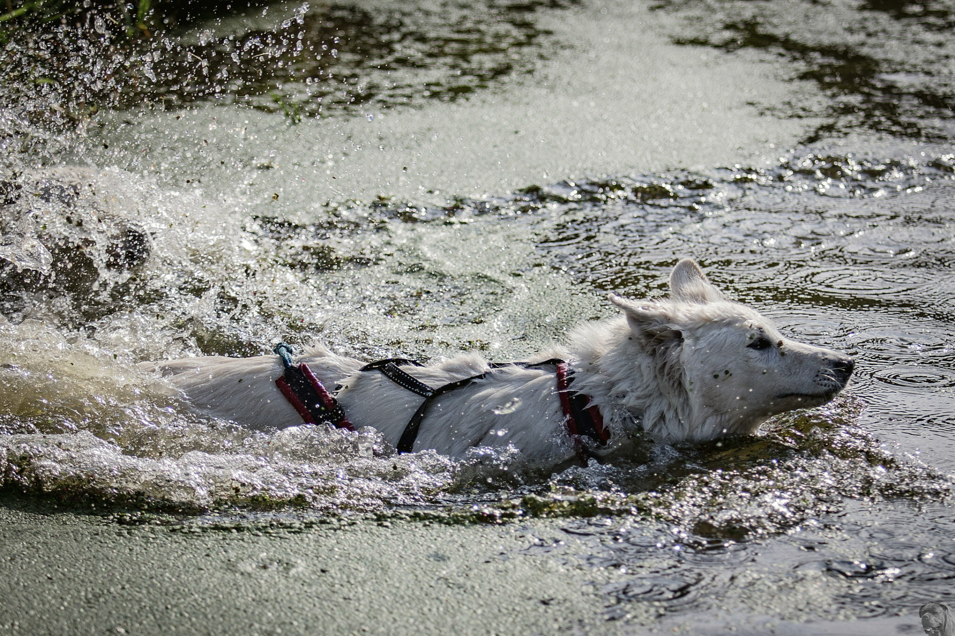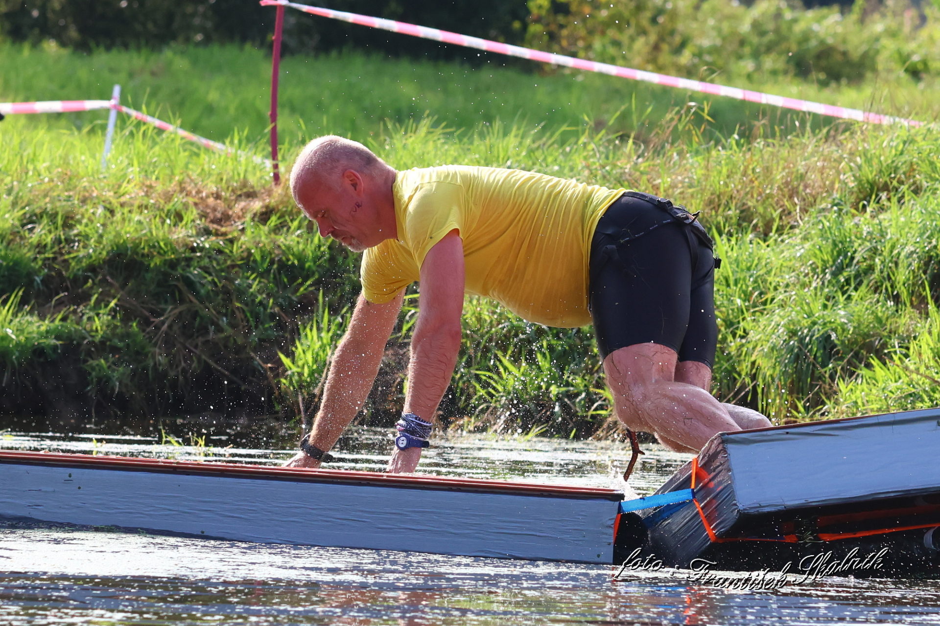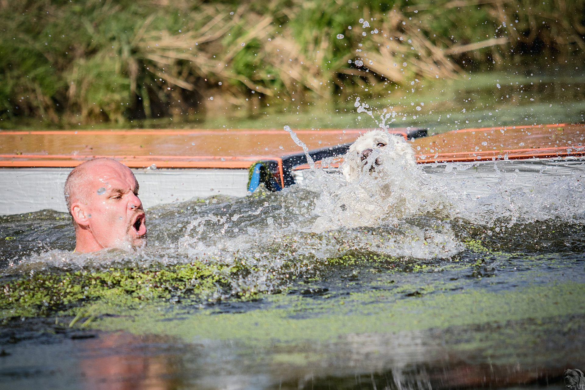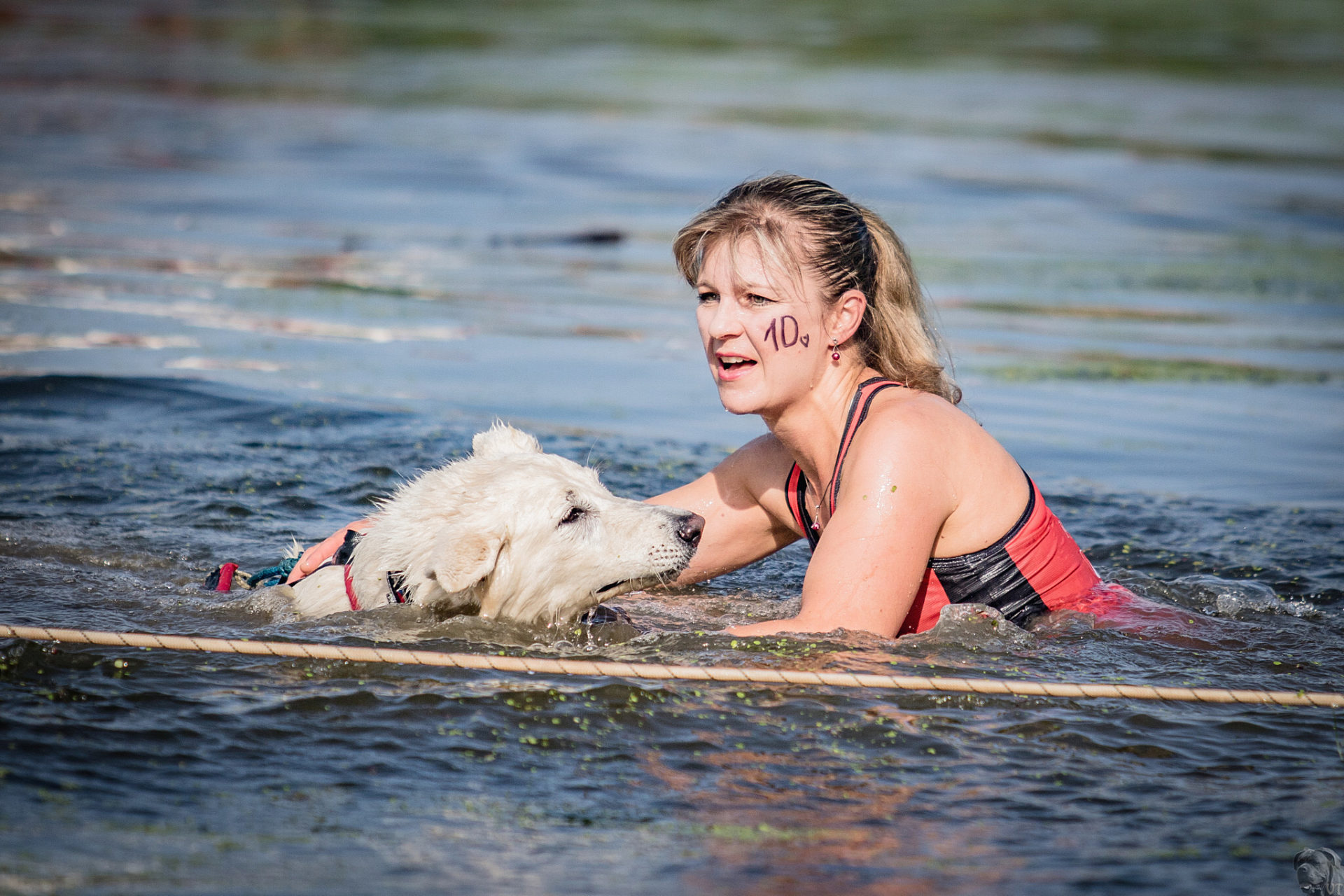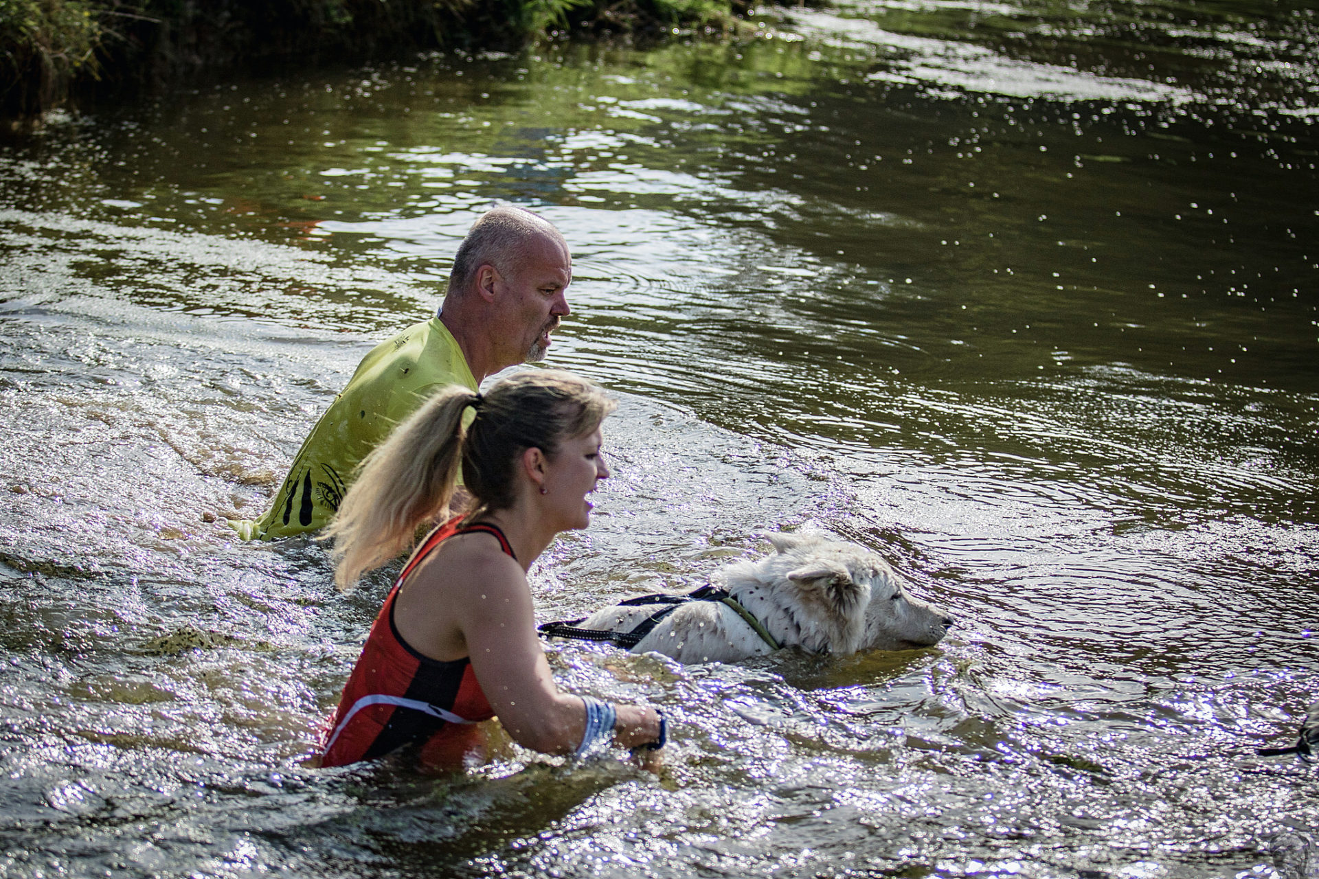 Startovali jsme hned po 9. hod, tak holt musíme běžet s větrem o závod, abychom se cestou stíhali ochlazovat a než sluníčko vyšplhá vysoko nad obzor, abychom byli zpátky. Cestou byla spousta vody (a chaluh a bahna a kopců), tak se člověk (i pes) naštěstí každou chvíli v něčem zchladil. Krosili jsme to po motokrosové trati levá, pravá, nahoru a hned zase dolů. Z pohledu diváka určitě zajímavá podívaná. Naprosto škodolibě se nám smáli, jak my na trati potíme krev. Já běžela s Amigou, Erik se poprvé na start postavil s Frozen. Frozen totiž dřív vždycky raději běhala s něžným pohlavím, s chlapama jí to nebavilo. Ale konečně pochopila, že i chlapy jsou co k čemu a vzala je na milost. I přes všechna úskalí jsme si závod užívali. Až do chvíle, než jsem doběhla k hodu oštěpem a měla se trefit na cíl. Házení není má silná stránka. Klasika, oštěp byl lehčí než jsem předpokládala, tak s sebou plácnul daleko před označeným prostorem. Pak se tam sice doklouzal, ale to prý „sorry jako“ – handicap „vězeň“. Svázali mi ruce stahovací páskou a prý další pomocník, kterého potkám, mě osvobodí… 100 m, 200 m, půl kiláku… začala jsem mít strach jestli si pomocník nepotřeboval zrovna odskočit. Ne, fakt byli tak zákeřní a nechali nás svázané běžet asi kilometr. Kdo tohle vymyslel, ten by fakt zasloužil,… ale ne metál, ale přes …. Asi se radši na stará kolena naučím házet. Běžím tedy dál, konečně mám obě ruce volné, tak se těším, že to půjde líp. Pěkný kulový. Další kilometr hnusný táhlý kopec, takže zase nic moc běhatelného. Uff, konečně nahoře. Vítaný odpočinek na pár překážkách, přešoupám slackline, odtáhnu pneumatiku, proplazím bazének a příjemně osvěžená valím dál. Erika jsem někde setřásla, asi kilometr za mnou nikde nikdo. Ale jen na chvíli, to nejtěžší teprve mělo přijít. Bylo jasné, že mi za chvíli bude zase dýchat na paty. Následoval krásný rychlý úsek mezi kukuřičnými poli, mírný seběh, travnatá cesta, běželo se mi kupodivu krásně a lehce, Amiga letěla přede mnou. Prostě paráda. Za kilometr odbočka do pole. To jako fakt? Jo, fakt. Další úsek přímo kukuřicí, chvíli po kraji, chvíli mezi rigoly, vzrostlými klasy a balvany z pole. To už taková parádička nebyla. Šlahouny mě šlehaly do obličeje, na cestu jsem místy přes hustý porost sotva viděla, volala jsem na Amigu „levá“, aby vyběhla aspoň na kraj pole, ale kukuřice byla jako neprostupná hradba. Konečně světlo na konci tunelu a ven z toho. Protože jsme si teď vlastně tak trochu odpočinuli, tak si pro nás připravili, už zase zpátky na motokrosové trati, pár silových záludností. Seběh a výběh s 5 kg barelem s vodou a hned o kousek dál 2x nahoru a dolů v drsném převýšení. Ani nevím, co bylo horší. Z kopce se bojím a do kopce docházely síly. V těchto pasážích má Erik nade mnou jasně navrch, tak celý můj náskok rychle dohnal a poslední dvě překážky už jsme překonávali společně a pak i společně proběhli cílem. Jako třešnička na dortu byla, že jsme se oba ve svých kategoriích umístili na druhém místě. V cíli už Erik zase šířil optimismem a prvotní rozladění bylo to tam. (Naštěstí!).