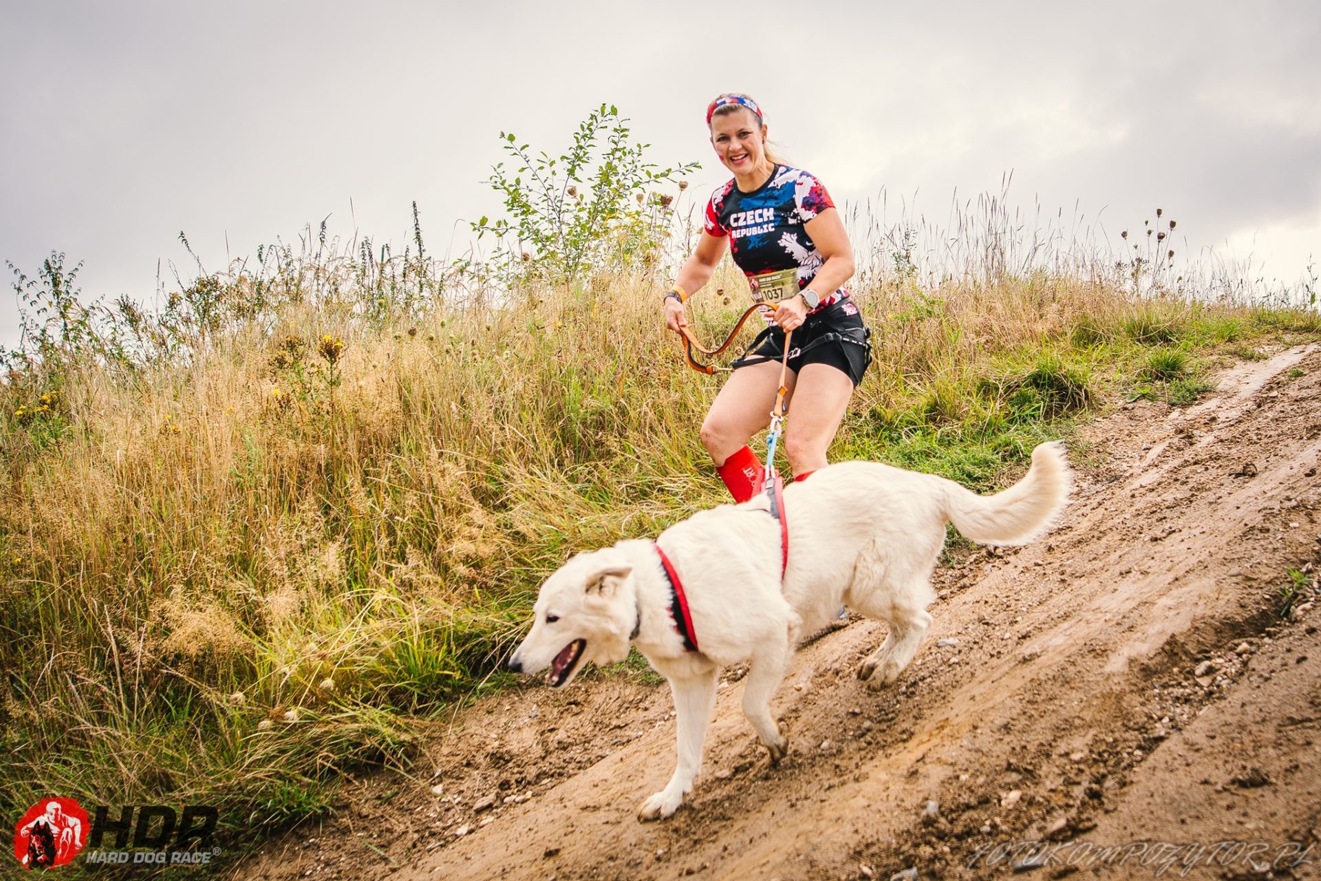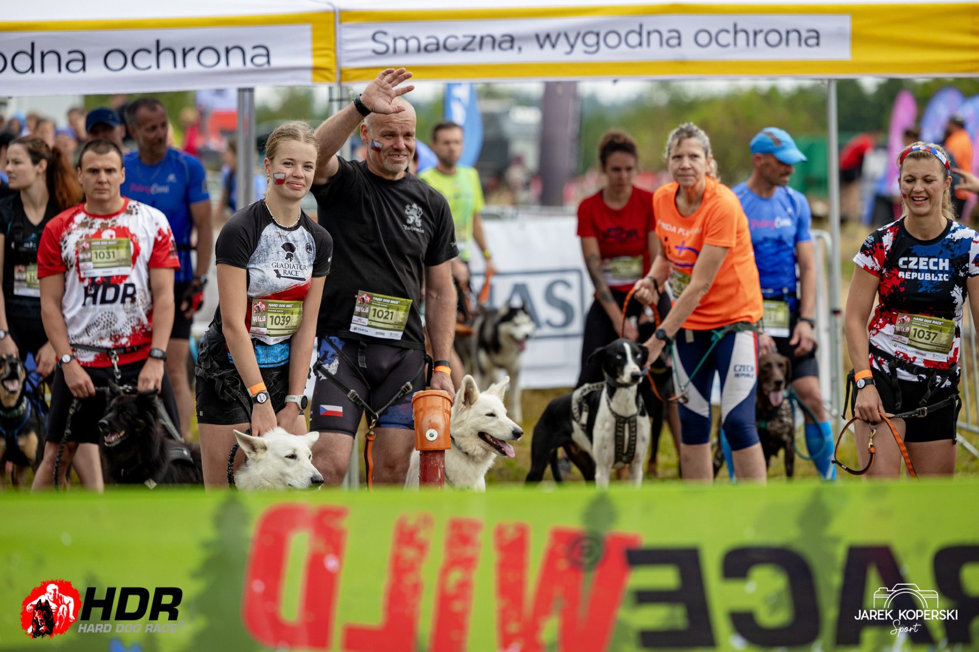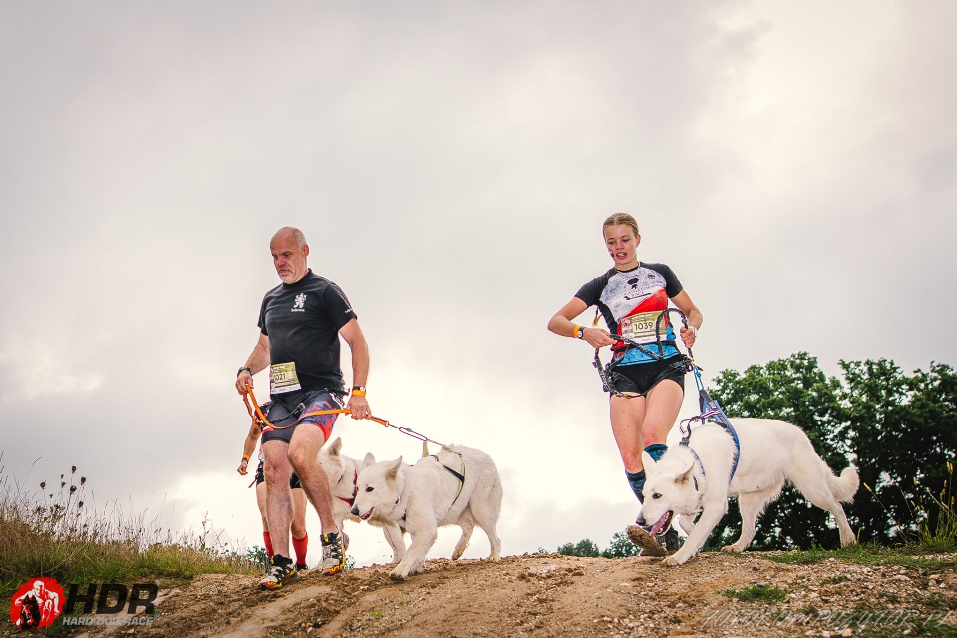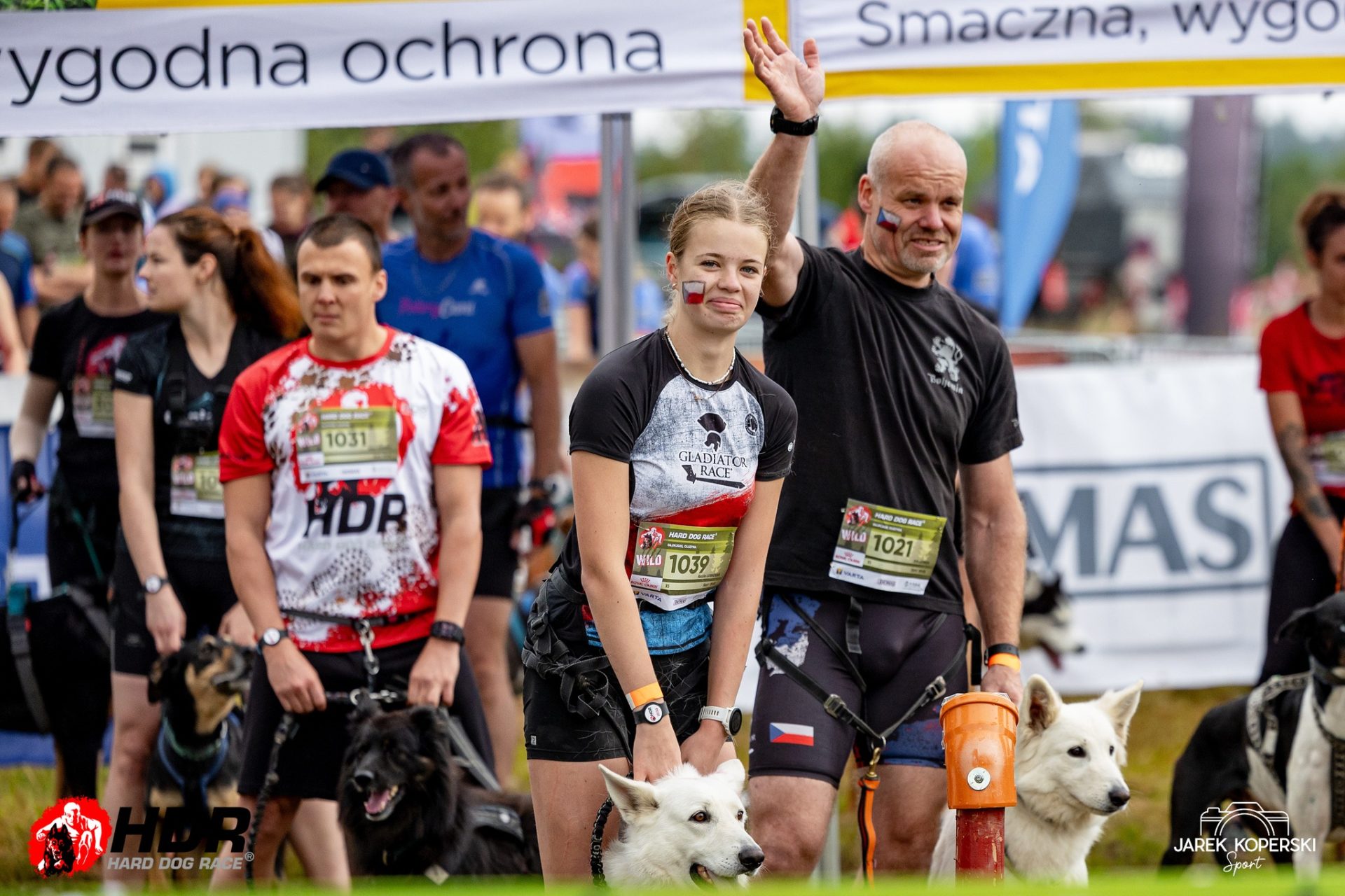 Náročnější a divočejší varianta závodu HDR, tzv. Wild. Původně plánovaný na 12 km, nakonec zkrácený „jen“ na 10 km + 22 překážek, ale i tak dostatečně výživný, náročná a prostě HARD. Po celonočním dešti byla motocrossová trať jedna velká blátivá skluzavka. Hned po startu mega krpál dolů jako dělaný na zlámání všech kostí v těle. Vyžadovalo to hodně sil přemluvit natěšené psy, že hned na startu musíme brzdit a pomalu sejít pár kopců. Pak různé houpačky nahoru a dolů, voda, bláto, překážky a zase voda a bláto a tak pořád dokola. Jak jsme již psali, toto byl první z dvou závodů v ten den, tak jsme se i vzhledem k terénu rozhodli ho běžet volně a jít so ho prostě pro jednou taky jen užít. A užili – my i psí parťáci. Bylo to parádní, ale vskutku náročné. Také proto je na tento závod zvýšený minimální požadovaný věk závodníka na 18 let. Tohle už není procházka, ale závod pro opravdu zdatné jedince, po těle i po duši. Jenže Natálce je 14, ale moc ho chtěla běžet. Tak jsme požádali pořadatele o „divokou kartu“. Doložili jsme její bohatou běžeckou kariéru a zkušenosti nejen z překážkových závodů a poskytli záruky, aby vše proběhlo hladce a především bezpečně. K naší velké radosti jsme od polských i maďarských pořadatelů dostali svolení startovat všichni společně, tedy i s Natálkou. O to víc jsme si to mohli užít a doběh všichni spolu ruku v ruce byl jen třešničkou na dortu. Nakonec jsme byli velmi překvapeni, že i v lehčím tempu jsme mezi ženami skončili na 7. + 8. místě ze 102 žen a Erik 16. z 63 mužů. Potkali jsme tam i nás odchov Faylu Fury Niktel s naším týmovým kolegou Jirkou. Mezi muži skončili na 5. místě. Gratulujeme!